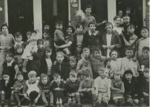 3. Foto B) wijkfoto: Meisje helemaal links boven >> Ploon. Breedlachende meisje met kindje op haar arm schuin onder huisnummer 63 >> Annie